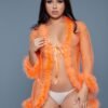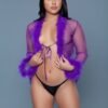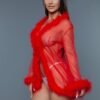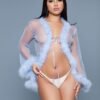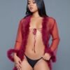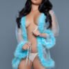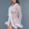 The black sheer lingerie robe features a feather-trimmed neckline and sleeves. This adds a playful touch. The robe stays comfortable throughout the day or night. The tie closure lets you adjust for the perfect fit. The design shows just enough while offering some coverage.